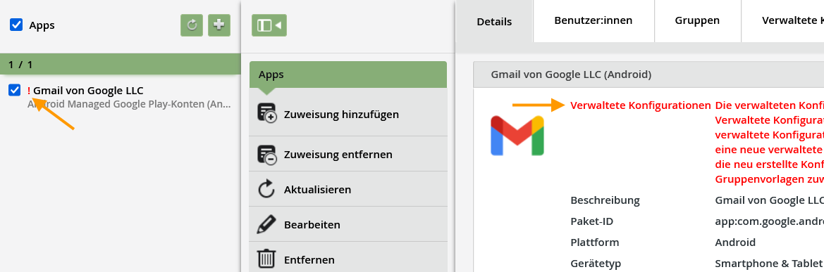 Die verwalteten Konfigurationen für Android-Apps sind umgezogen. Ab sofort können Sie diese im oberen Menü der App-Verwaltung einrichten. Migrieren Sie Ihre veralteten verwalteten Konfigurationen jetzt! Die veralteten Konfigurationen werden ab dem 01.10.2023 nicht mehr unterstützt.