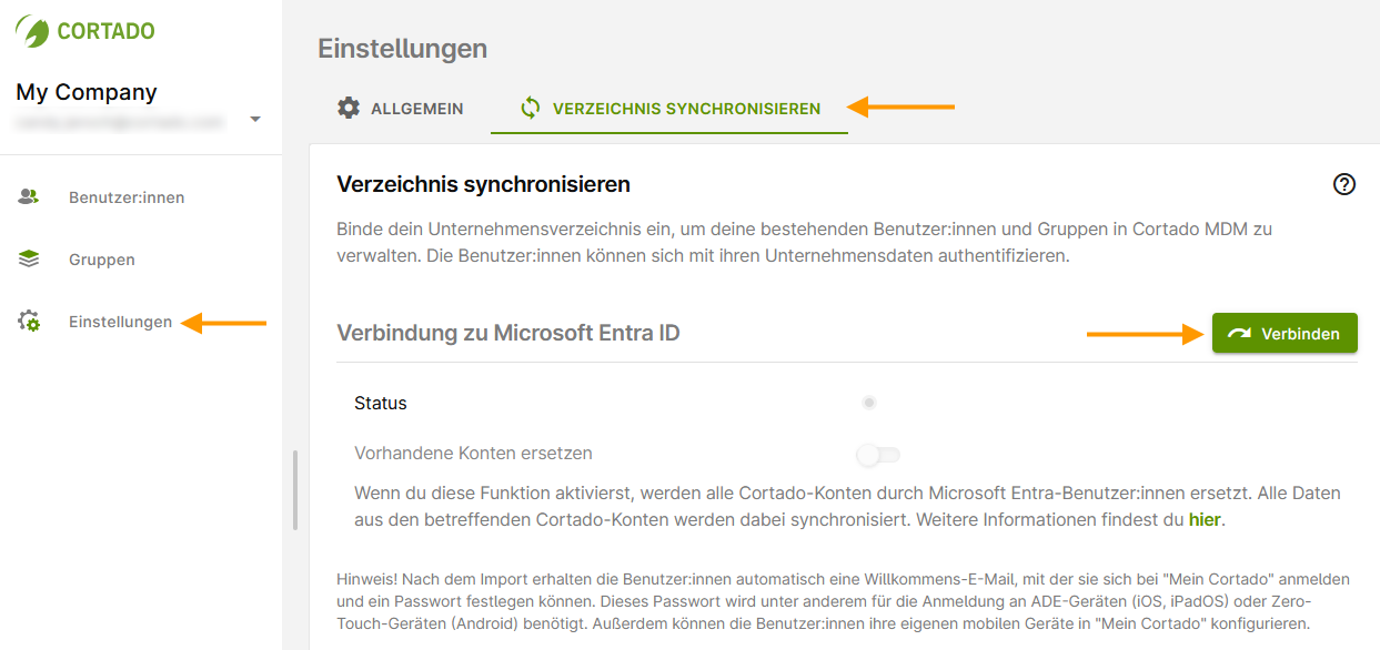 - Automatische Willkommens-E-Mail: Hier (unterer Pfeil im Bild) kannst du einstellen, ob deine Benutzer/-innen eine Willkommens-E-Mail erhalten sollen. Diese E-Mail informiert sie darüber, wie sie sich im Benutzerportal Mein Cortado anmelden könne, um ihre Geräte einzurichten.