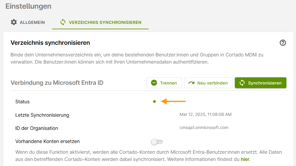 Microsoft Entra ID wurde erfolgreich mit dem Cortado Verwaltungsportal verbunden, wenn der Status einen grünen Punkt anzeigt (Pfeil im Bild). Jetzt kannst du deine Entra-Gruppen importieren, wie das geht erfährst du in unserem Hilfe-Artikel Gruppen aus Microsoft Entra ID importieren.