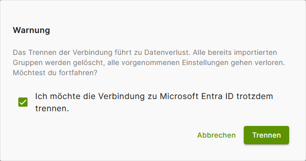 - Trennen: Hier können Sie die Verbindung zwischen dem Cortado Verwaltungsportal und Microsoft Entra ID wieder trennen. Beachten Sie hierbei, dass alle Gruppen, die Sie bereits importiert haben, wieder gelöscht werden. Außerdem gehen alle Einstellungen, die sie bereits vorgenommen haben verloren. Die Zuweisung von Richtlinien, Profilen, Apps und verwalteten Konfigurationen wird aufgehoben. Wenn Sie sich danach erneut verbinden müssen all diese Einstellungen neu konfiguriert werden.