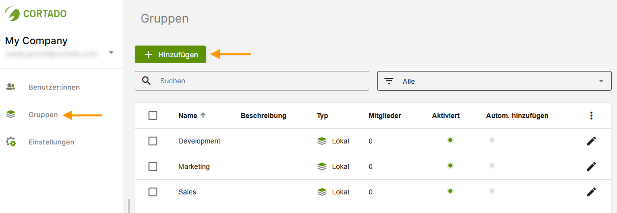 - Klicke unter Gruppen (linker Pfeil im Bild) auf Hinzufügen (rechter Pfeil im Bild).