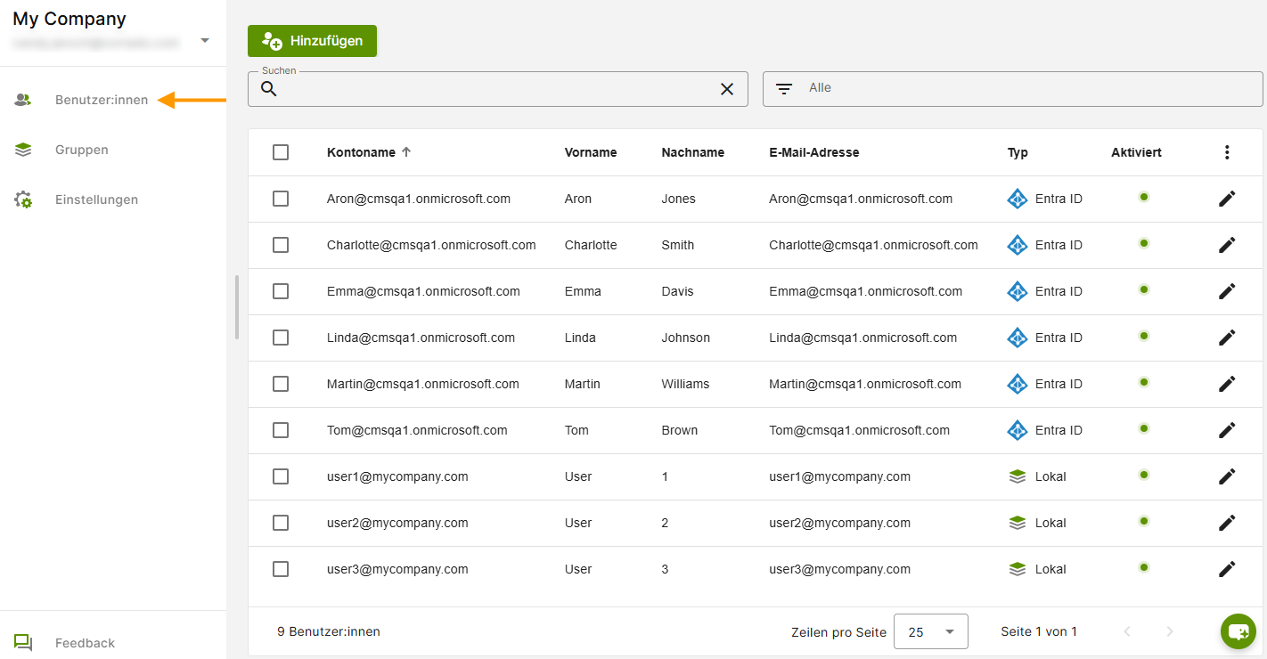 - Unter Verwaltung→ Benutzer:innen finden Sie die zusammen mit den Gruppen importierten Entra-Nutzer/-innen.