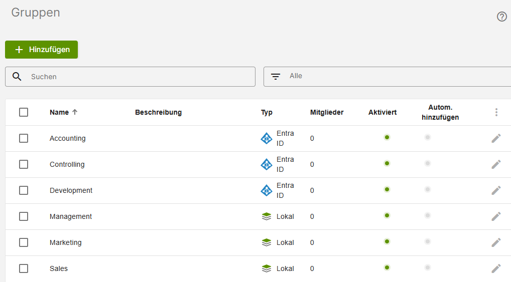 Nach dem erfolgreichen Import findest du deine neu hinzugefügten Gruppen in der Übersicht. Unter Typ kannst du sehen, ob es sich um eine Lokale Gruppe oder eine Microsoft Entra-Gruppe handelt. Wie du lokale Gruppen hinzufügst, erfährst du in unserem Hilfeartikel Lokale Gruppen erstellen.