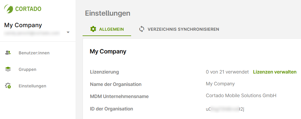 - Lizenzierung: Hier erhältst du einen Überblick über deinen Lizenzverbrauch. Wie du deine Lizenzen verwaltest, zeigen wir dir in unserem Hilfe-Artikel So verwalten Sie Ihr Abonnement für Cortado MDM.
