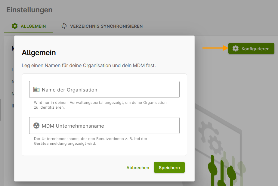 - Klicke auf Konfigurieren (Pfeil im Bild), um den Namen der Organisation und/oder den MDM Unternehmensnamen zu ändern.