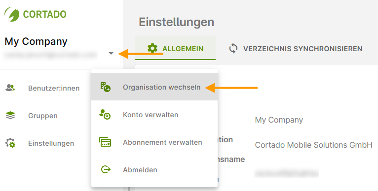 Wenn du mehrere Organisationen mit Cortado MDM verwaltest, kannst du links oben im Verwaltungsportal, zwischen den Organisationen wechseln.