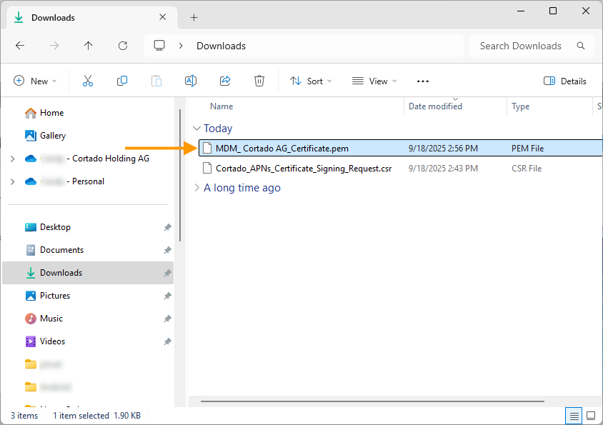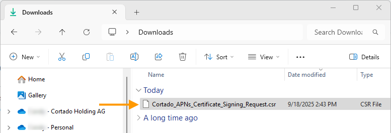 The downloaded, signed CSR file will be saved in your downloads folder (arrow in illus.).