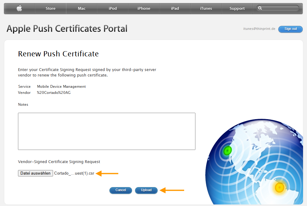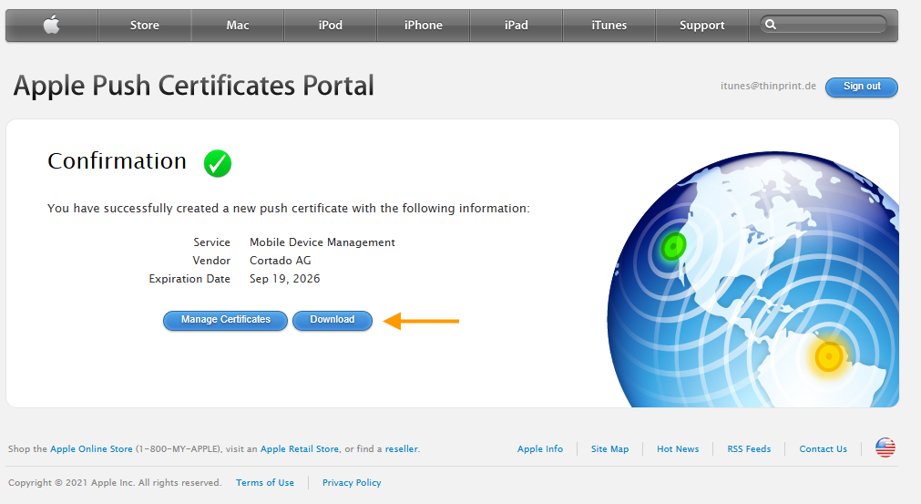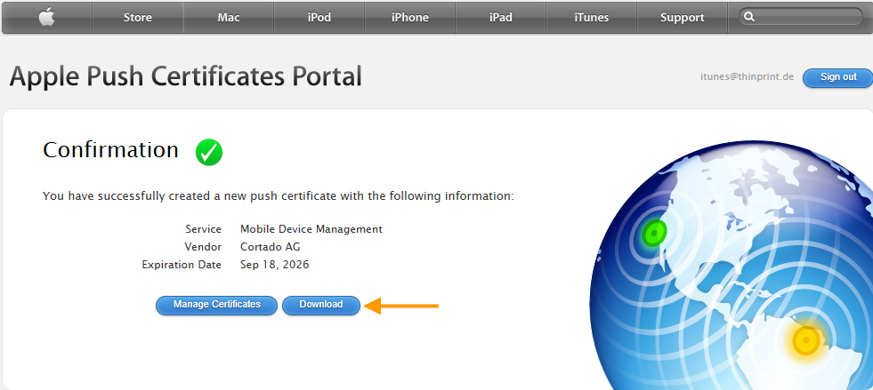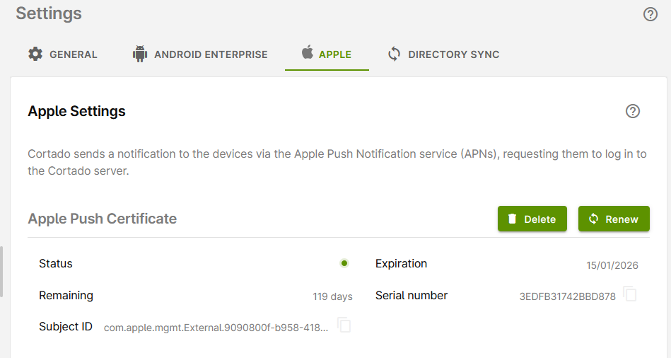 An Apple Push Certificate is required for establishing a secure connection between the Cortado Administration Portal and iOS/iPadOS/macOS devices. Cortado sends the corresponding notification to the device via the Apple Push Notification service (APNs), requesting that it log in to Cortado. So no information is transmitted. The Apple Push Notification Service only wakes the device from hibernation, so that it can be logged on to Cortado. All configuration information, settings and requests go via an (encrypted) SSL connection directly from the administration portal to the iOS/iPadOS/macOs devices.