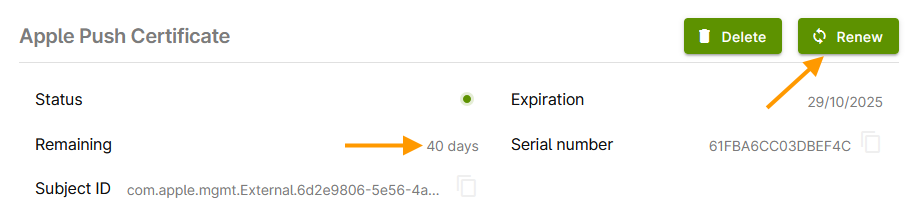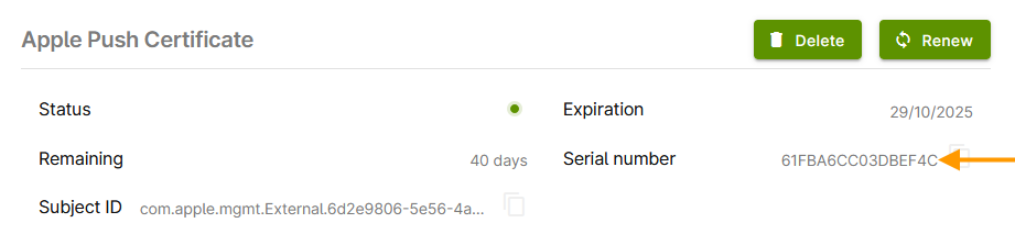 The successfully uploaded Apple Push certificate will then be displayed in the administration portal: