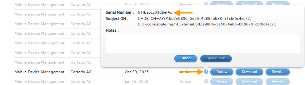- Check in the Apple Push Certificate Portal, using the serial number of the certificate, whether it is the certificate to be renewed. You can find the serial number (upper arrow in illus.) by clicking on the Info button (lower arrow in illus.).
