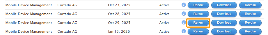Attention! To renew the certificate, do not use the Create a certificate button, but rather the Renew button. Otherwise, you will generate a new certificate and all users will have to re-register their devices.