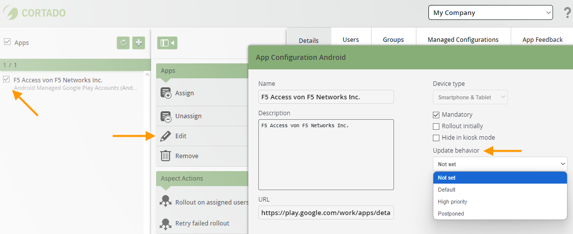 Note! The update behaviour for the Cortado app is set to High priority by default.