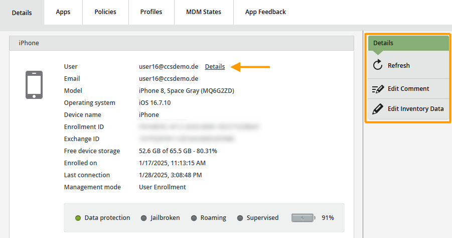 In the device overview, you will see which user uses each device. You can also get information about the device (Model, Operating system, Device memory etc.). In addition, you can get information on the status of certain functions of the device (Data protection, Jailbroken, Roaming, Supervised, Bluetooth, Wi-Fi, eSIM Support etc.). Each of these functions is generally available on the device as soon as it is listed. The current status can be seen as follows: