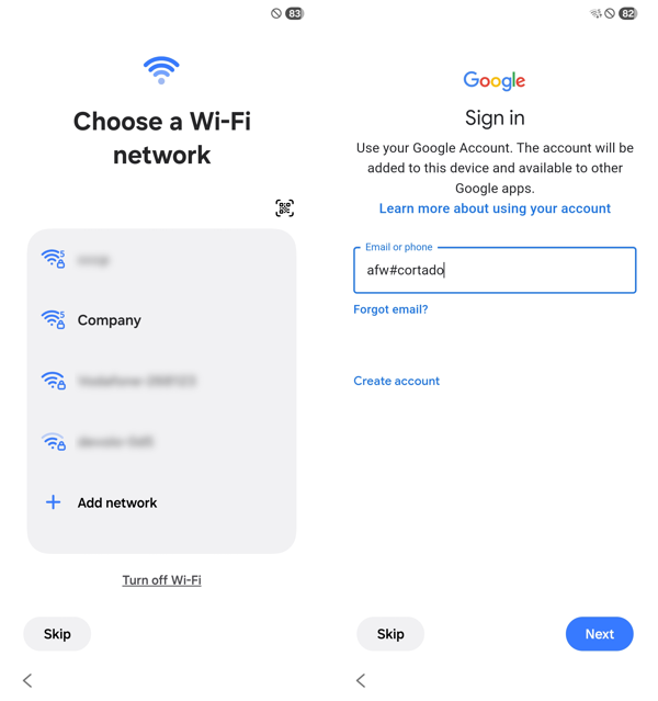- Instead of your Google account, enter the identifier afw#cortado (upper arrow in left illus.) and then tap on Next (lower arrow in left illus.).