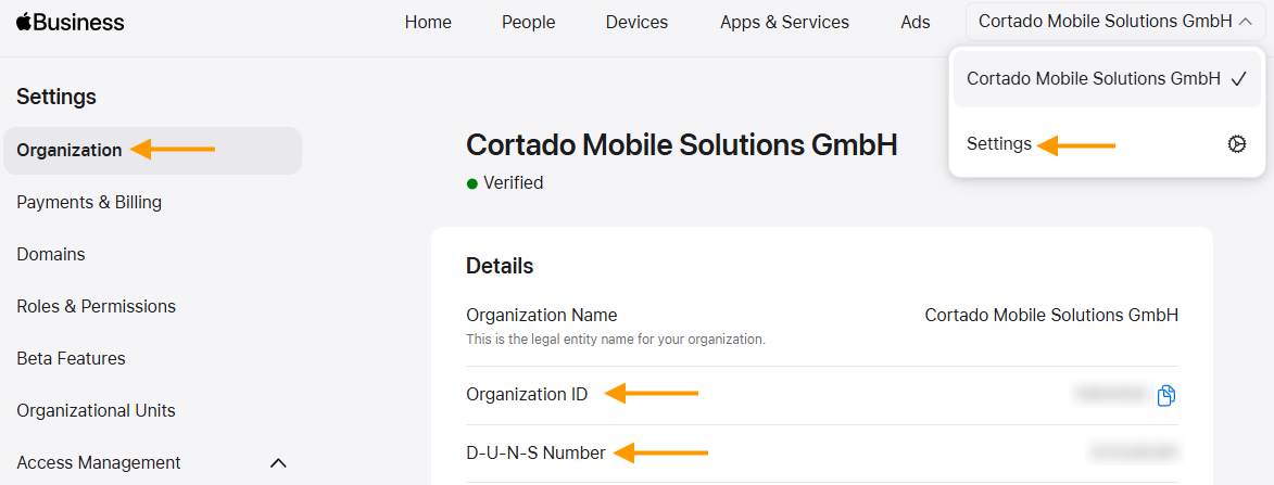 - Then enter it under Settings→ Organization in Apple Business (arrows in illus.).
